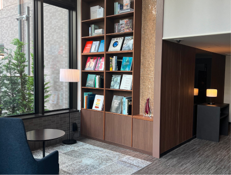 1階には、2層吹き抜け&ガラス張りの広々とした構造の「ライブラリーラウンジ」を設置しております。読書・ネットサーフィン・ビジネスなど様々な用途で使用していただけます。