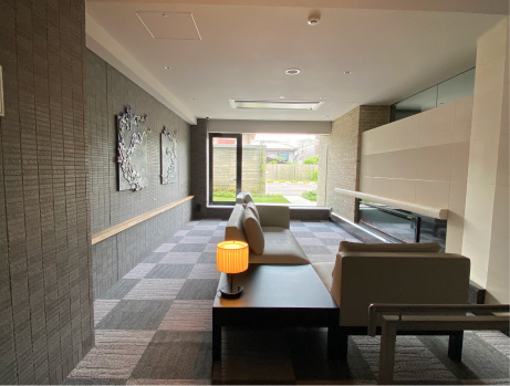 建物1階には、電気式の暖炉を設置した共有のガーデンラウンジをご用意。外から差し込む自然光と優しいLED式の炎のゆらめきが心を落ち着かせてくれます。